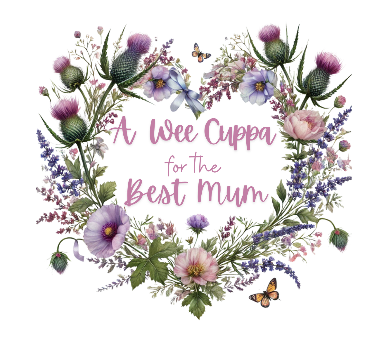 We have here the perfect gift for Mum….a gorgeous mug for her to call her very own…. she can sip her morning cuppa while enjoying the heart garland design incorporating butterflies, Scottish thistles, heather, roses and delicate foliage in muted pastel colours. The text within the heart garland is: