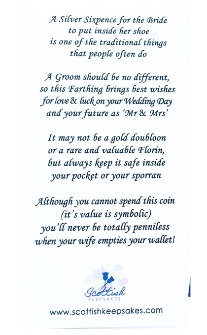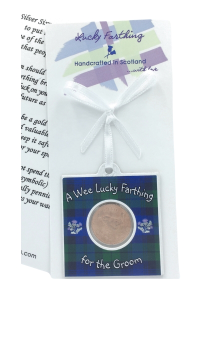 - Flower of Scotland, Black Watch or Royal Stewart tartans ~ standard text is “A Wee Lucky Farthing….for the Groom”